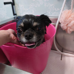 真っ白でお耳の長いマリちゃん、炭酸泉温浴中のお写真がうさぎさんのようで可愛すぎますー♡(*^。^*) お母さんが「困り者の“こまり”ちゃんなんです」と仰ってましたが(笑)、そんな事ないですおりこうさんですよ~!(^^) 伸ばし中のお口周りもボリュームが出てきましたね♪ 常にテーブルからジャンプしようとしているチャレンジャーなマリちゃんです♡笑